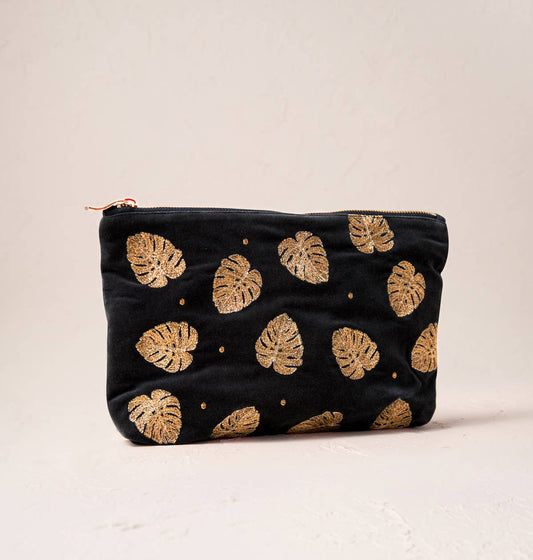 Gold Jungle Leaf Everyday Pouch - Charcoal Velvet