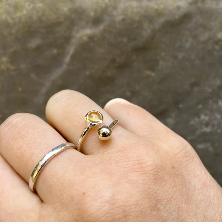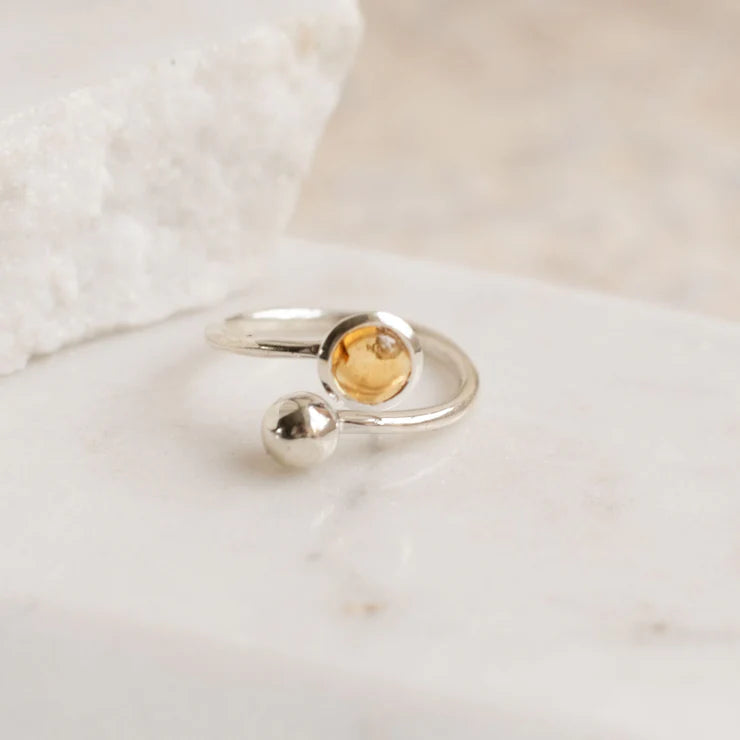 A Sterling Silver Adjustable Ring featuring a Silver Ball and a Citrine Birthstone.