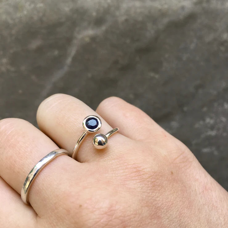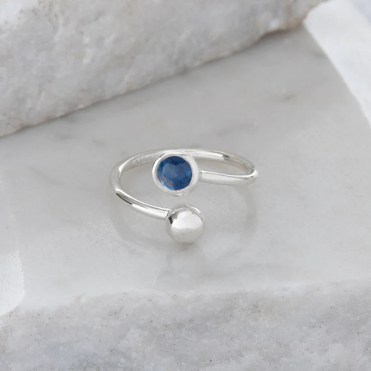 A Sterling Silver Adjustable Ring featuring a Silver Ball and a Sapphire Birthstone.