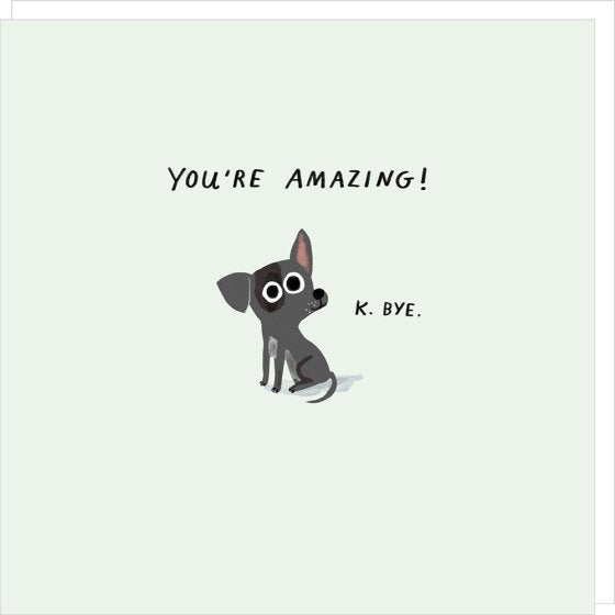 A humorous birthday card from Rosie Made a Thing's Dog Days collaborative range with John Bond, 'You're amazing! K. Bye'. Hand illustrated image of a cute little pup. Blank inside.