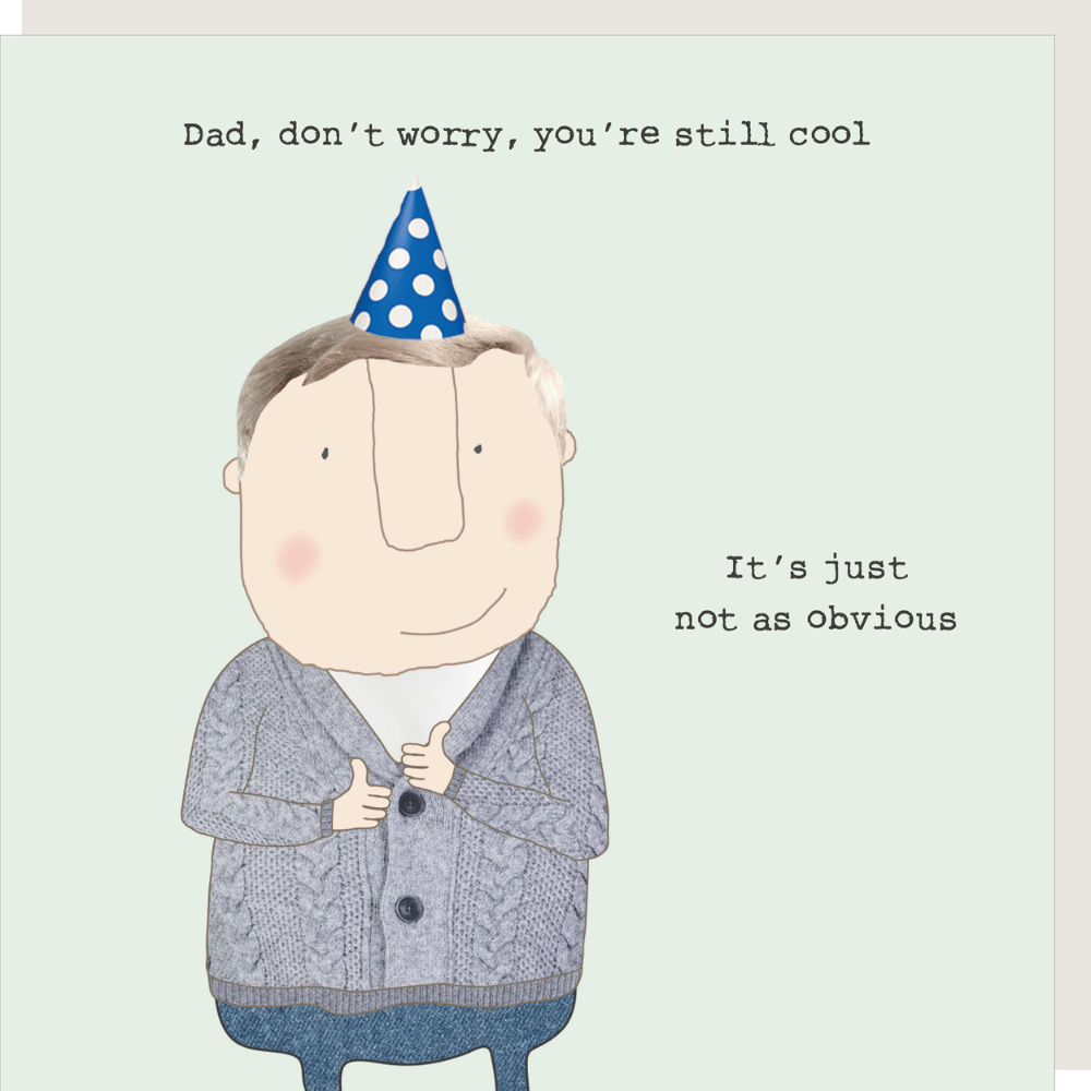 Funny birthday card for the Dads who still think they’re ‘cool’. ‘Dad, don’t worry, you’re still cool. It’s just not as obvious.’ Blank inside for your own ‘cool’ message. Designed and printed in the UK on luxury 300gsm card, comes with a pebble envelope.