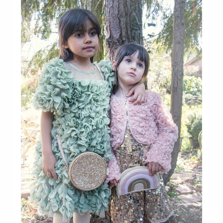 Brighten up even the rainiest day with our enchanted rainbow bum bag! In a palette of beautiful soft colours with gorgeous gold glitter and soft velvet, this cute bag is fully lined with a satin spotty fabric, a zip closure, adjustable strap and belt loop.