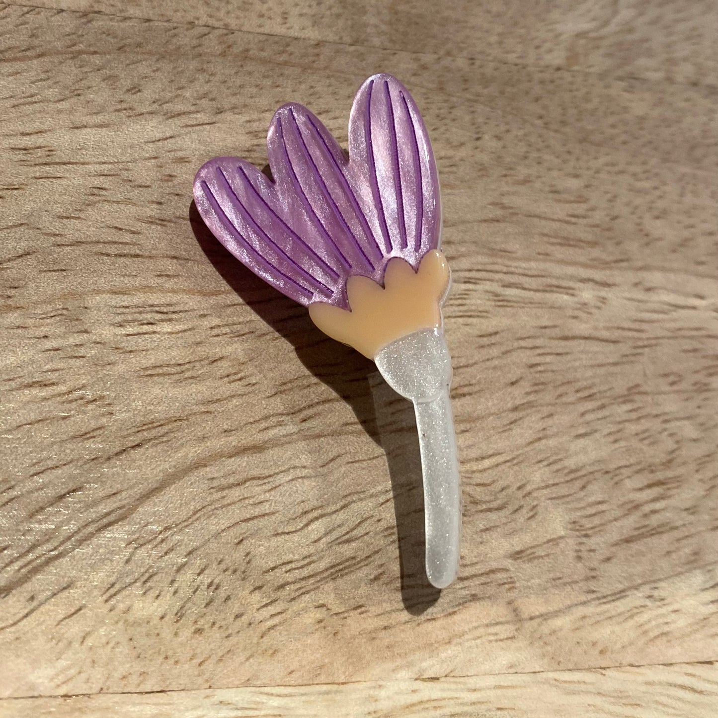 A pretty Lilac and mother of pearl coloured resin brooch with a silver plated back. This is a fair trade product beautifully made in South Korea.