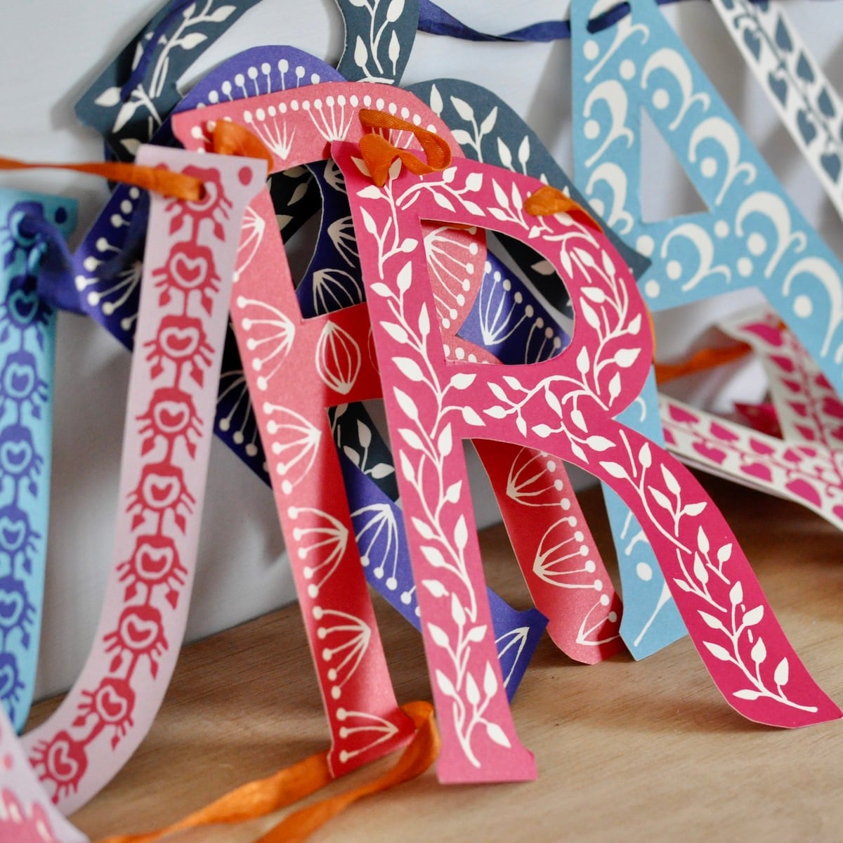 Twelve large double-sided patterned card letters which spell out HURRAY HURRAY with sixteen further star and flower ornaments. The letters are in assorted colours and designs, all with a strong folk art aesthetic, contained in a self-closing card wallet for long term storage. String together on yarn or ribbon of your choice. The letters are a generous 185 mm tall and the garland makes a dramatic decorative feature. Makes approximately 2-3 metres of garland, depending on how closely the letters, flowers and stars are strung together. Thread is not included.