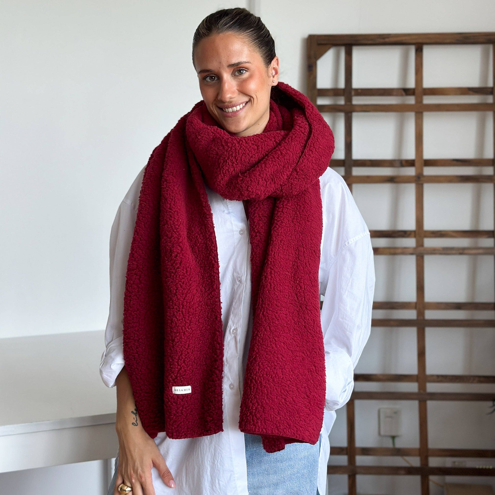Large scarf with thick maroon sherpa fabric, soft and warm. For proper maintenance, it is recommended to wash it in cold water and not use a dryer.
