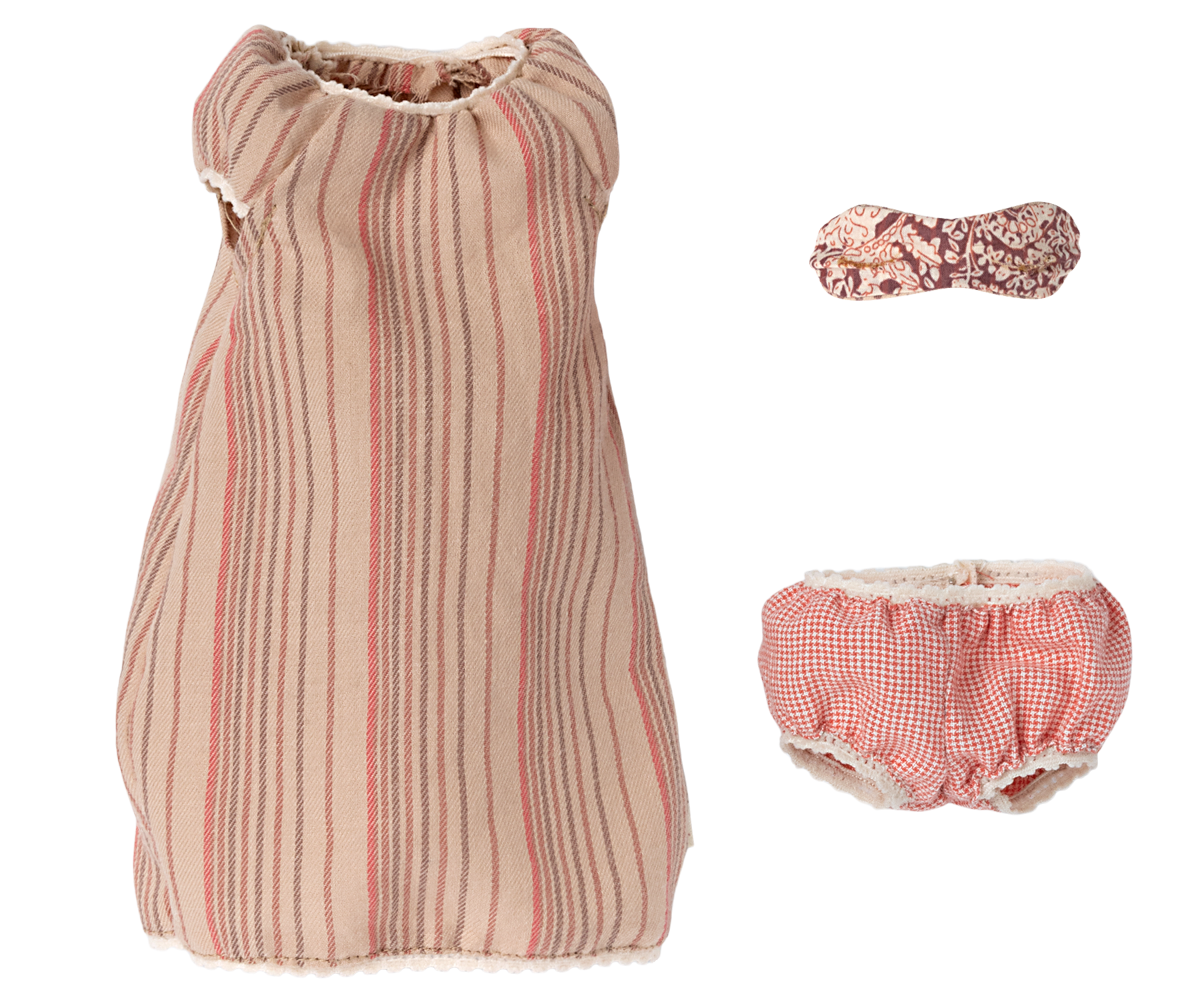 This medium mouse is dressed in a nightgown and has a sleeping mask to ensure a good nights sleep.