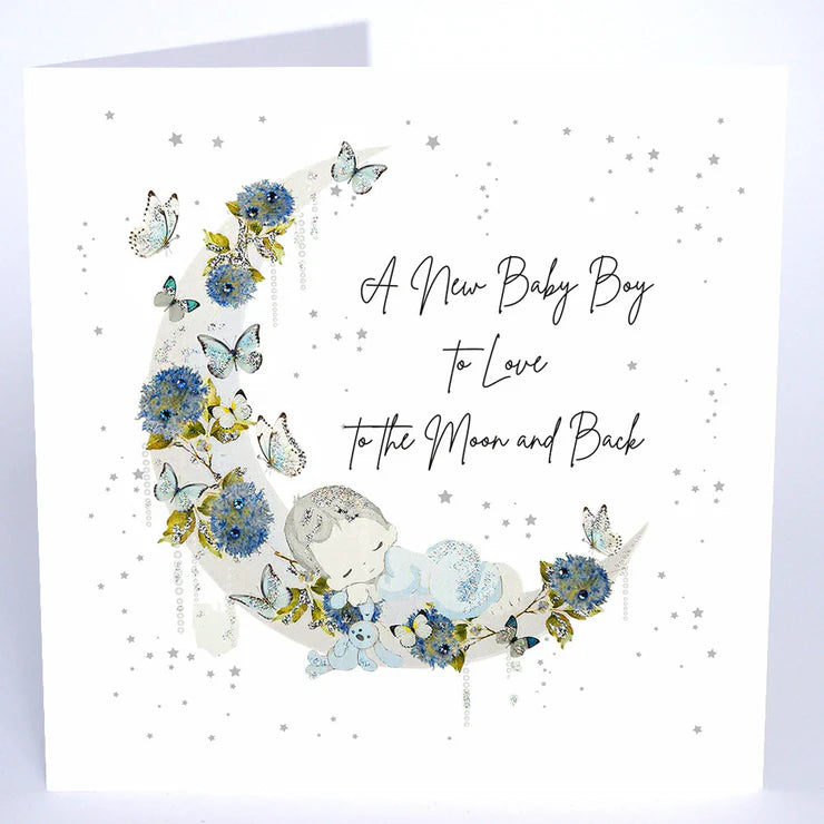 Nature springs to life with butterflies and blossom; cherry, peach, lilac and mimosa ~ it’s pure flower power! Hand painted Large New Baby Boy cards in peachy hues and brilliant iridescent coloured glitters. Each Large design is finished with genuine crystals.