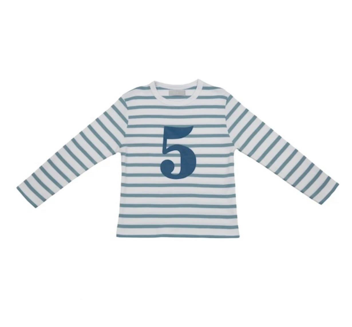 Ocean blue & white breton striped cotton T shirt, featuring a denim blue number 4 screen print. Long Sleeves only.