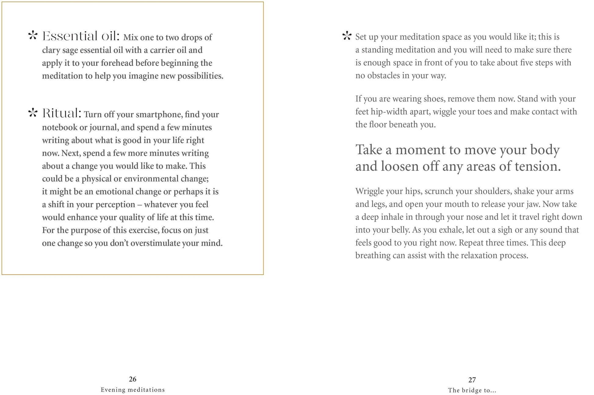 Research shows that imagining a sea breeze or a still lake is as mentally beneficial as actually being there. The meditations in this beautifully illustrated book are written specifically to help the reader slow down a busy mind, let go of the day and relax into a restful night's sleep. All the senses are gently engaged to help the reader put down their worries and turn them over to the unconscious world, and welcome in calm and restoring energy.