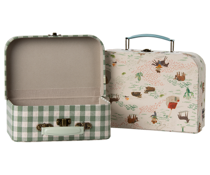 A perfect suitcase set to store all your favorite items. Each suitcase is covered by unique Maileg fabrics and has colored metal handles. This 2 pcs set is perfect for storage and for carrying your favorite toys