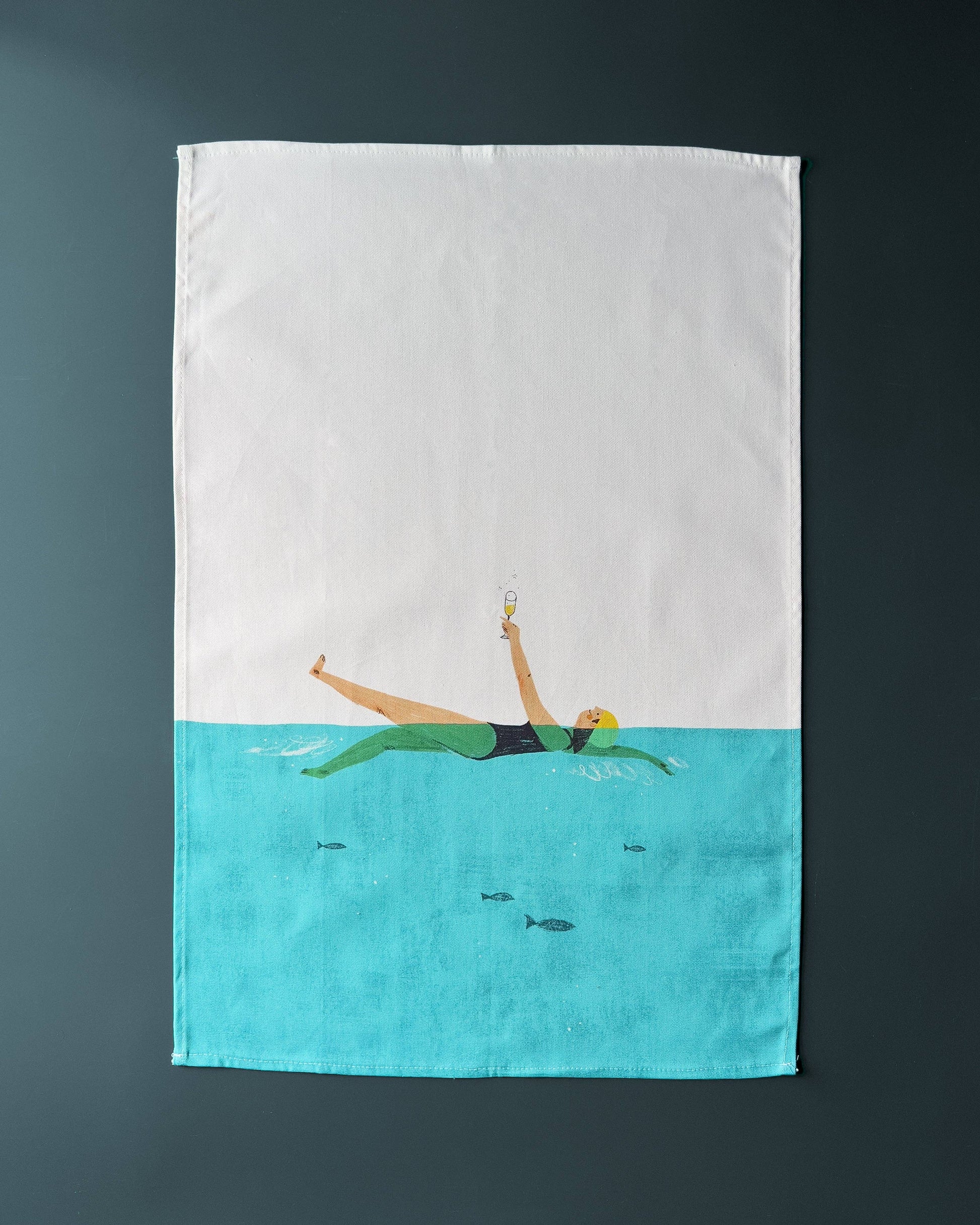 A tea towel printed with the popular Swim and Fizz artwork by Oldfield Design Co.