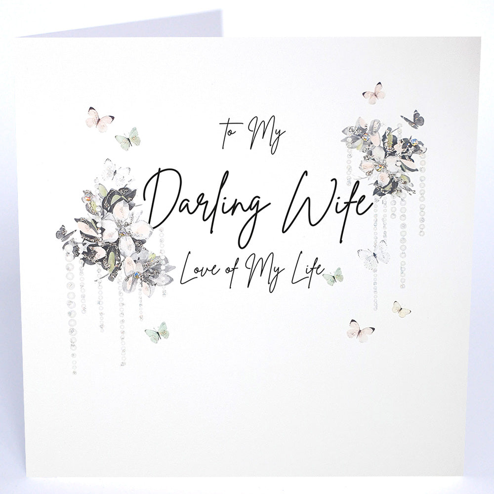 A design of pure magic! Subtle watercolour board is the canvas for these large, individually hand painted Darling Wife cards. These are out and out keepsakes, where nostalgia meets enchantment. With a complementing envelope.