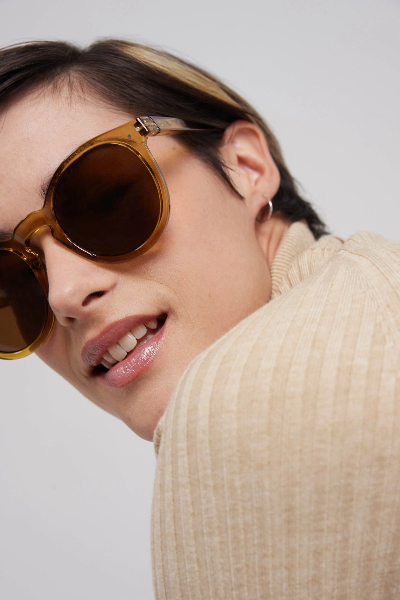 Sunglasses - #M shape : round, oversize - Crystal, shiny and bio-sourced frame - 100% UV Category 3 protection - Mixed and universal model - Storage pouch included in the box.