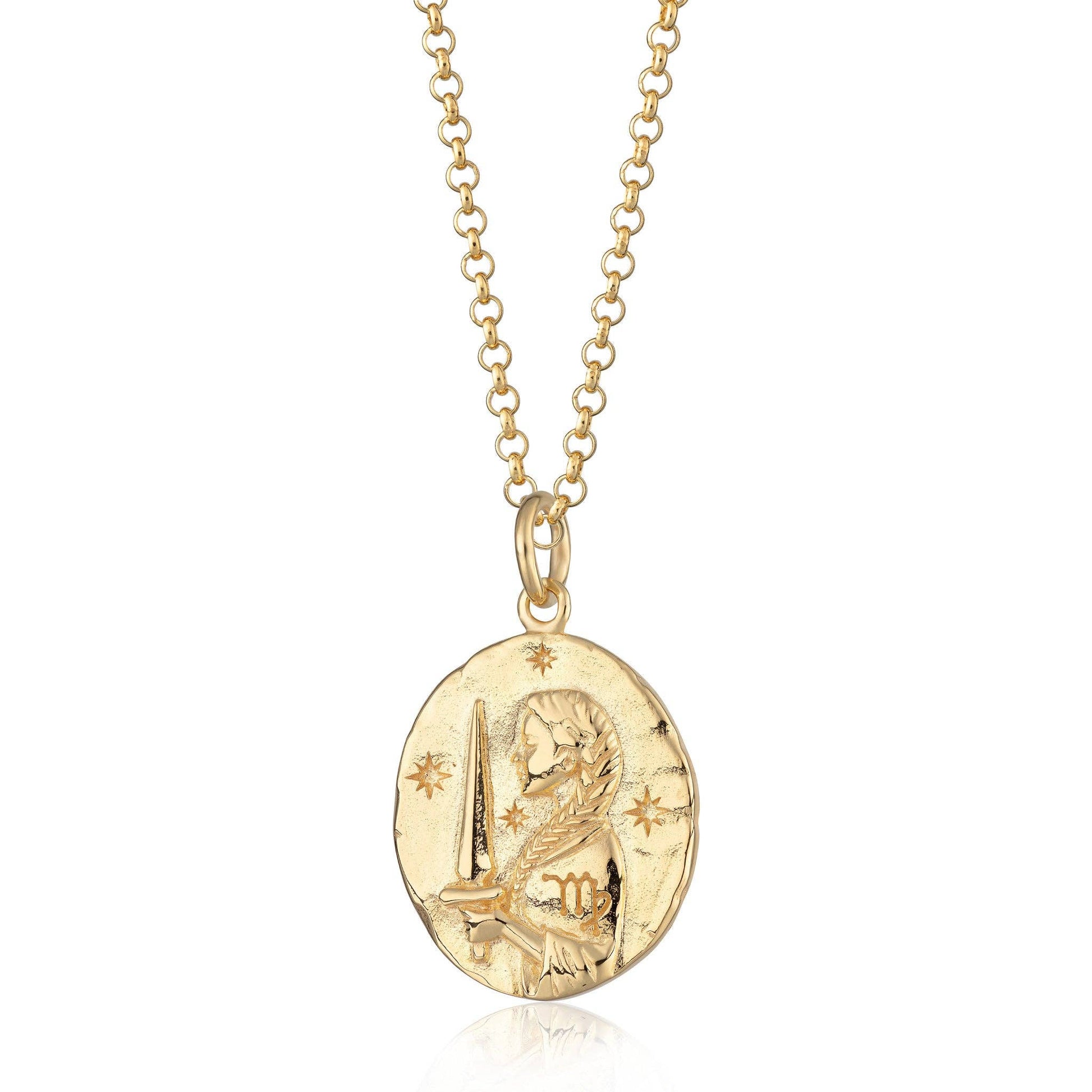 This horoscope necklace has been carefully sculpted to feature a maiden with long plaited hair, holding a sword to represent Virgo's strength and engraved on her arm is Virgo's well known astrological symbol. Each coin has been given a mottled edge to create a vintage feel, while the back has been left smooth to sit perfectly when worn.