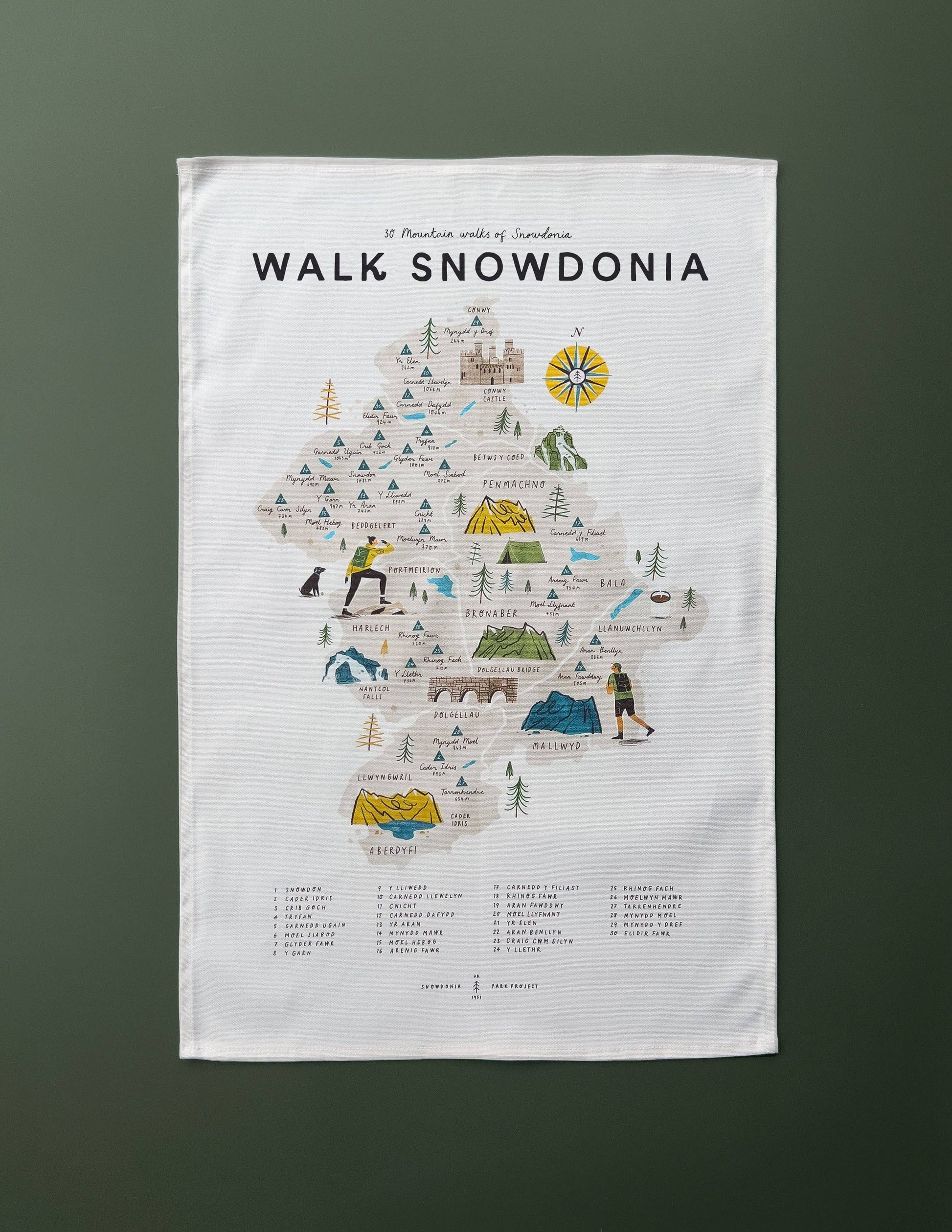 A tea towel printed with a map of 30 mountain walks of Snowdonia (Eryri) by Oldfield Design Co.